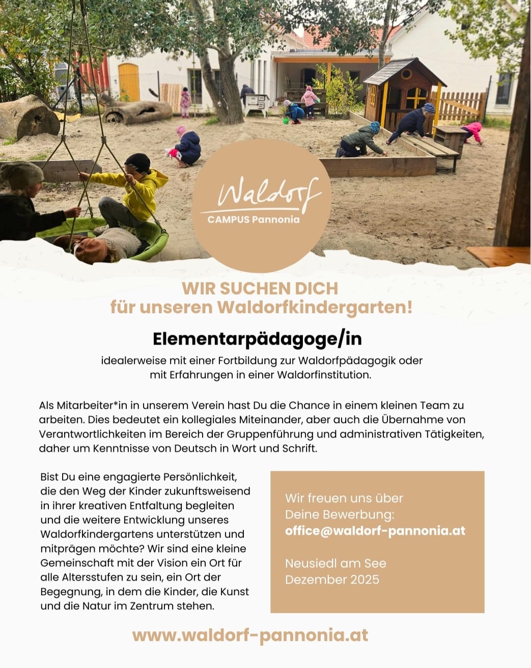 Stellenangebote Kindergarten Kindergarten Bildungszentrum an der Wien Waldorfkindergartenpädagog/in, ab September 2025, Voll- oder Teilzeit [pdf, 298.7 kB] Freie Waldorfschule und Waldorfkindergarten Graz Kinderbetreuer*in, 35 Stunden, ab Februar 2026 [pdf, 195.1 kB] Karl Schubert Schule Wien Elementarpädagogin/Elementarpädagoge Kindergarten 34 Stunden [pdf, 189.2 kB] Kindergartenleiterin/Kindergartenleiter 32 Stunden ab September 2025 [pdf, 195.4 kB] Pädagogische Assistenzkraft [pdf, 143.1 kB] Waldorf Campus Salzburg Stellenausschreibung KIGA Aigen HelferIn/Pädagogische Fachkraft [pdf, 416.3 kB] Waldorfkindergarten im Zentrum Wiens 2. Pädagog*in für Kinder von 2–4 Jahre 30-33 Stunden ab September 2025 [pdf, 195.1 kB] Waldorfkindergarten Mödling Kindergartenassistent*in 30 Wochenstunden ab September 2025 [pdf, 1.6 MB] Waldorfkindergarten Pannonia Elementarpädagoge/in [jpeg, 200.8 kB] Waldorfkindergarten Wels Elementarpädagog*in/ pädagogische Assistenzkraft 23–26 Stunden ab November 2025 [pdf, 268.7 kB]