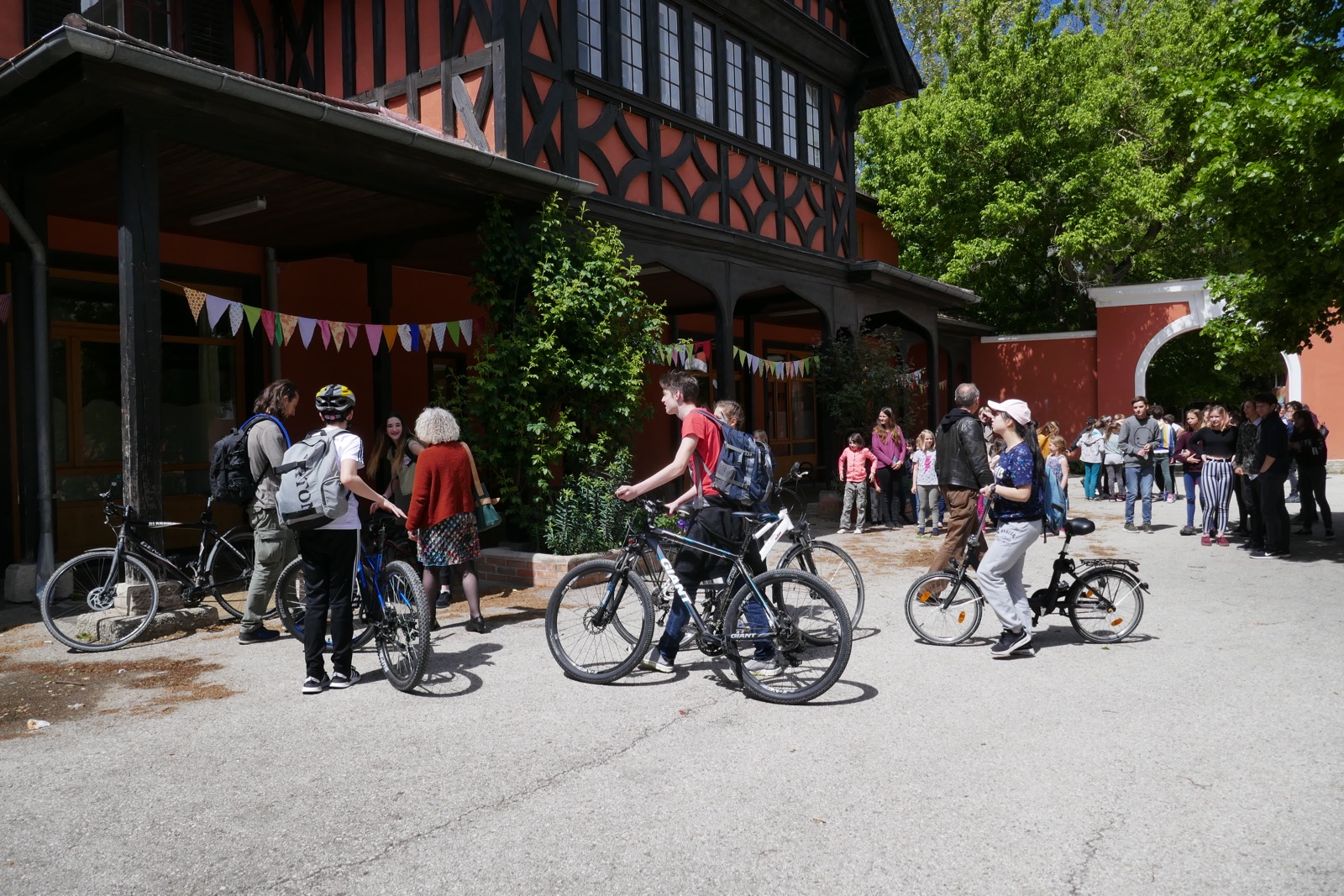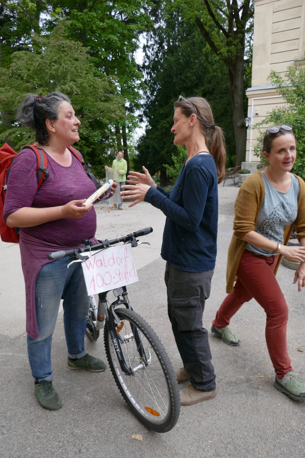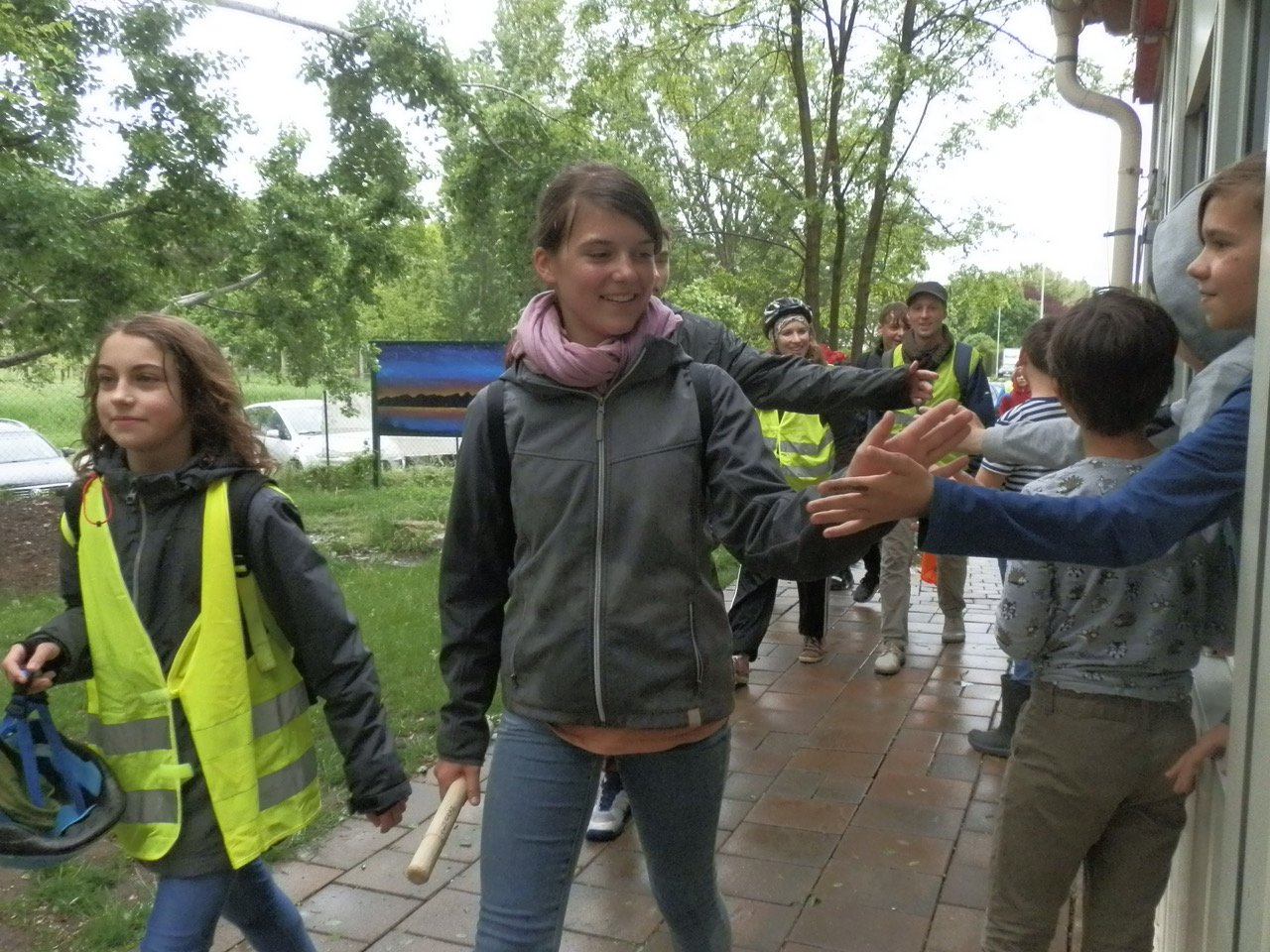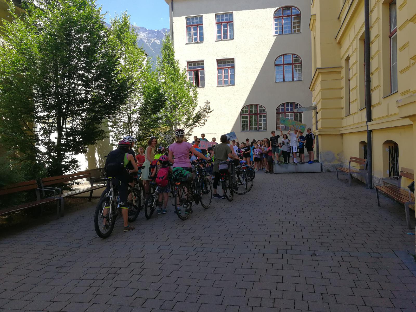 Diese Fotos zeigen die Übergabe von der Sonnenlandschule Eisenstadt an die Waldorfschule Pannonia. Es war ein sehr gespanntes Warten, denn wir wussten nicht, ob es sich wirklich ausgeht. Ich hatte Kontakt mit Regina Thurner, Klassenlehrerin von Eisenstadt, damit wir wissen, wann sie bei uns ankommen. Es wurde ein kleines Buffet für die Sportler aufgebaut. Doch durch das grausliche Regenwetter und einige Pannen auf dem Weg zu uns, kamen die Eisenstädter erst kurz nach 12.00 bei uns an und mussten dann den Zug um 13.00 erwischen, da sie für die vielen Räder Platz im Zug reserviert hatten. Trotzdem war es ein schnelles und lustiges Aufeinandertreffen und wir haben uns gefreut die Gäste in unserer Schule willkommen zu heißen.