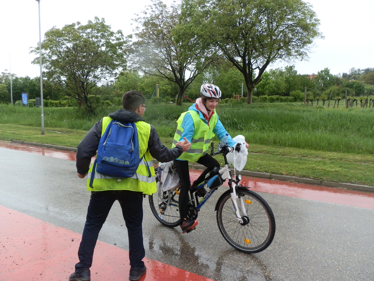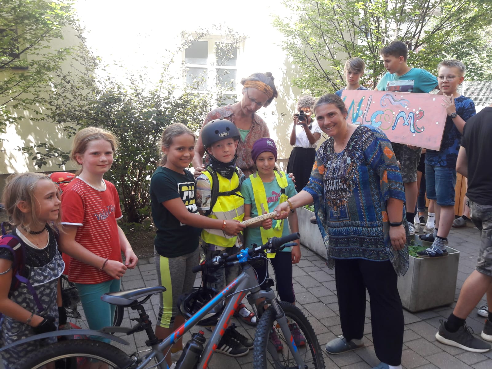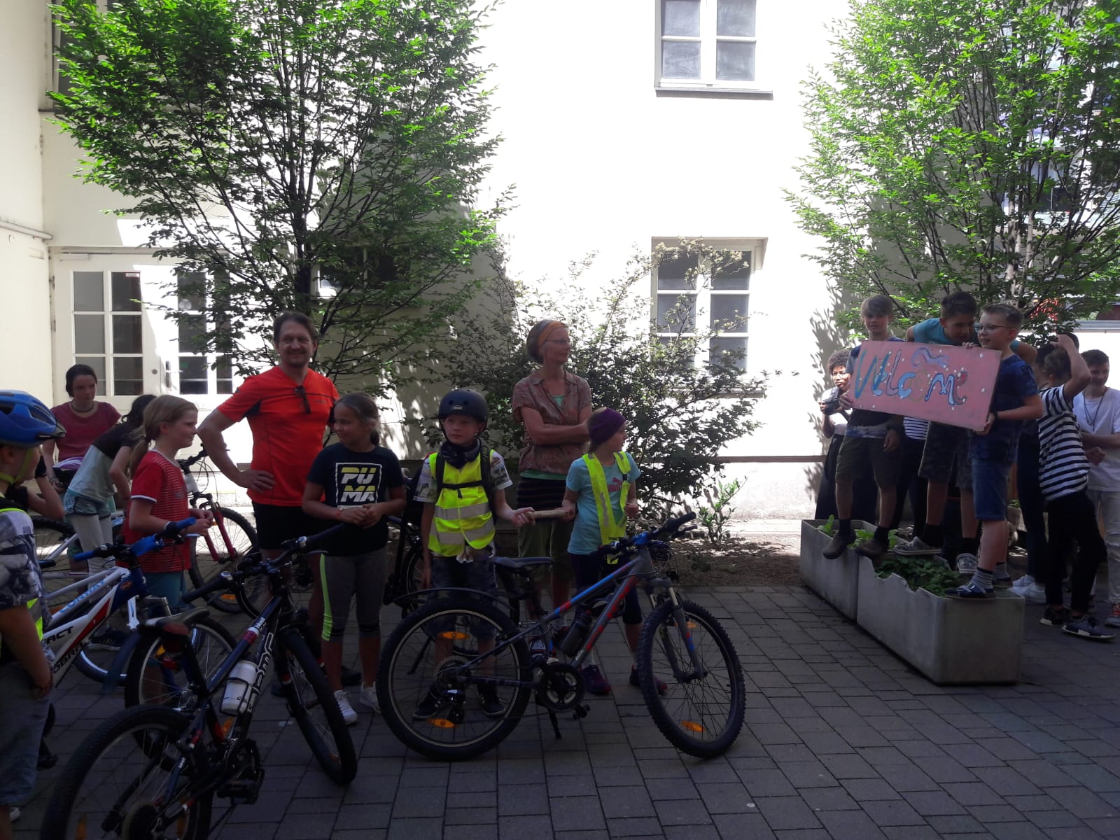Diese Fotos zeigen die Übergabe von der Sonnenlandschule Eisenstadt an die Waldorfschule Pannonia. Es war ein sehr gespanntes Warten, denn wir wussten nicht, ob es sich wirklich ausgeht. Ich hatte Kontakt mit Regina Thurner, Klassenlehrerin von Eisenstadt, damit wir wissen, wann sie bei uns ankommen. Es wurde ein kleines Buffet für die Sportler aufgebaut. Doch durch das grausliche Regenwetter und einige Pannen auf dem Weg zu uns, kamen die Eisenstädter erst kurz nach 12.00 bei uns an und mussten dann den Zug um 13.00 erwischen, da sie für die vielen Räder Platz im Zug reserviert hatten. Trotzdem war es ein schnelles und lustiges Aufeinandertreffen und wir haben uns gefreut die Gäste in unserer Schule willkommen zu heißen.