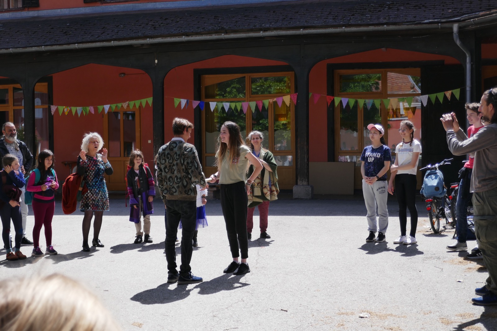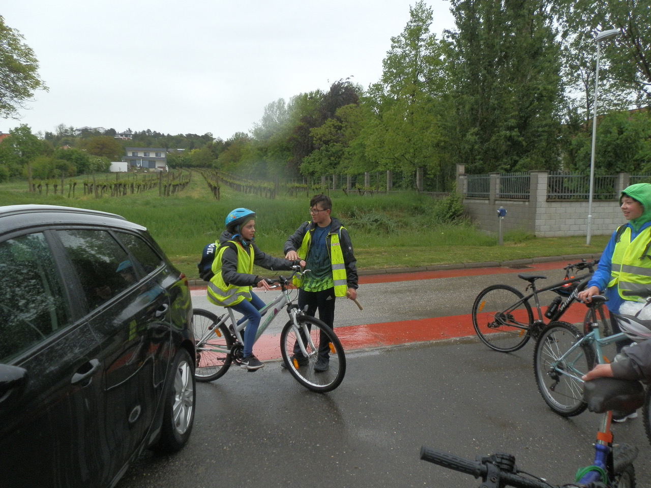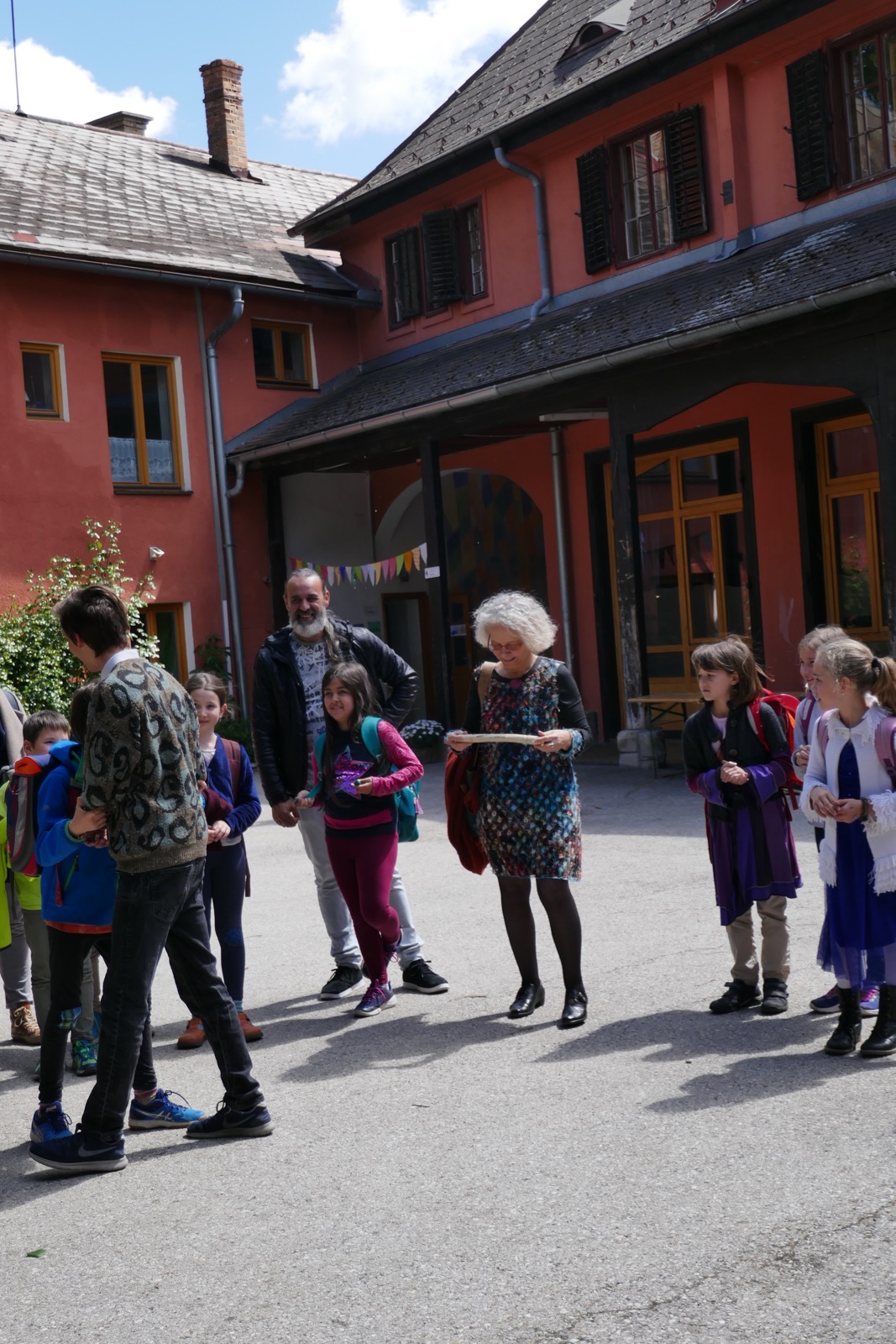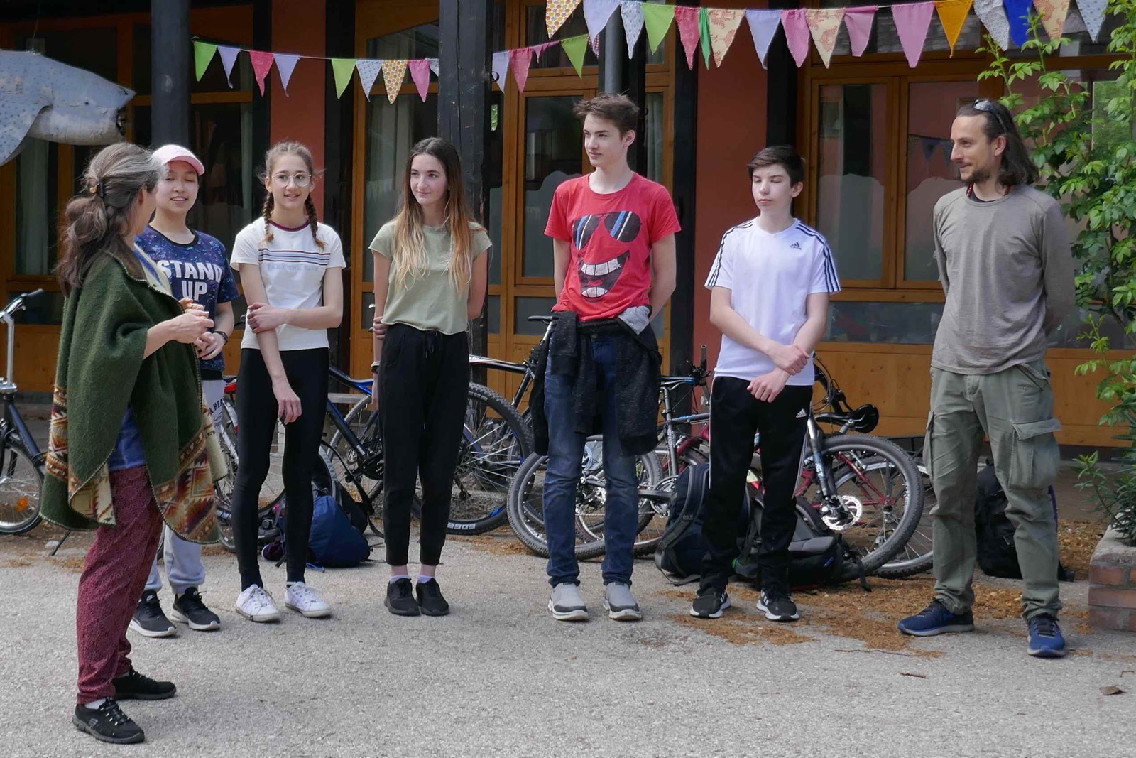 Diese Fotos zeigen die Übergabe von der Sonnenlandschule Eisenstadt an die Waldorfschule Pannonia. Es war ein sehr gespanntes Warten, denn wir wussten nicht, ob es sich wirklich ausgeht. Ich hatte Kontakt mit Regina Thurner, Klassenlehrerin von Eisenstadt, damit wir wissen, wann sie bei uns ankommen. Es wurde ein kleines Buffet für die Sportler aufgebaut. Doch durch das grausliche Regenwetter und einige Pannen auf dem Weg zu uns, kamen die Eisenstädter erst kurz nach 12.00 bei uns an und mussten dann den Zug um 13.00 erwischen, da sie für die vielen Räder Platz im Zug reserviert hatten. Trotzdem war es ein schnelles und lustiges Aufeinandertreffen und wir haben uns gefreut die Gäste in unserer Schule willkommen zu heißen.